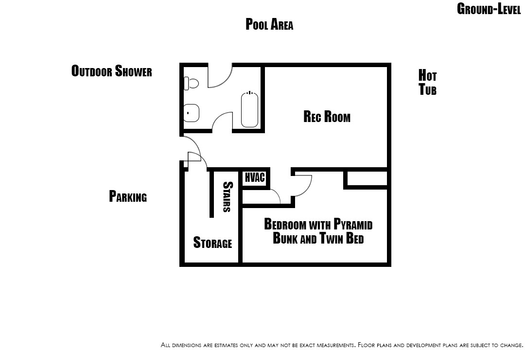 Ground-Level: Rec Room with Smart TV, Pool Table, Mini-Fridge, and Deck Access; Bedroom with Pyramid Bunk Bed, Twin Bed, Trundle, and Smart TV; Hall Full Bathroom.