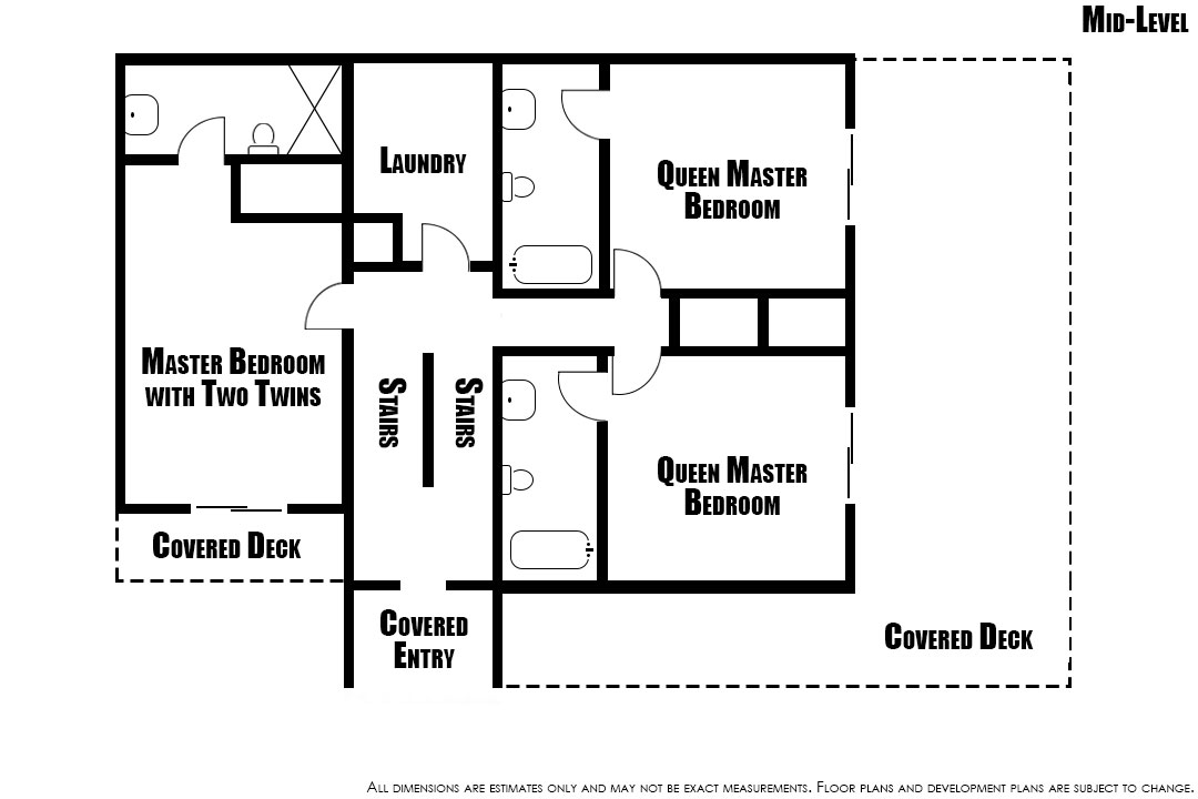 Mid-Level: Queen Master Bedroom with Smart TV, Deck Access, and Attached Full Bathroom; Queen Master Bedroom with Smart TV, Deck Access, and Attached Full Bathroom; Master Bedroom with 2 Twin Beds, Smart TV, Deck Access, and Attached Full Bathroom; Laundry Room.