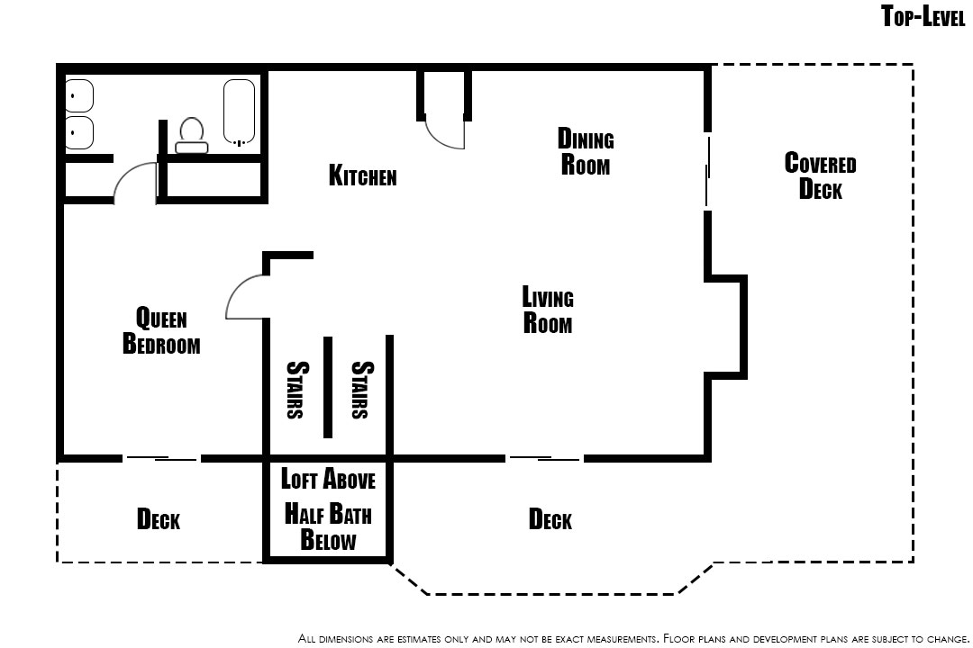 Top-Level: Living Room with Smart TV, Fireplace (Gas), and Deck Access; Loft; Dining Room with Table (seats 12), and Deck Access; Kitchen with Bar (seats 4), Blender, Coffee Maker (Drip & Keurig), Dishwasher, Microwave, Oven/Stove, Refrigerator, Toaster, Pots, Pans, Dishes, and Cooking Essentials; Queen Master Bedroom with Smart TV, Deck Access, and Attached Full Bathroom with 2 Sink Vanity and Tile Shower; Hall Half Bathroom.