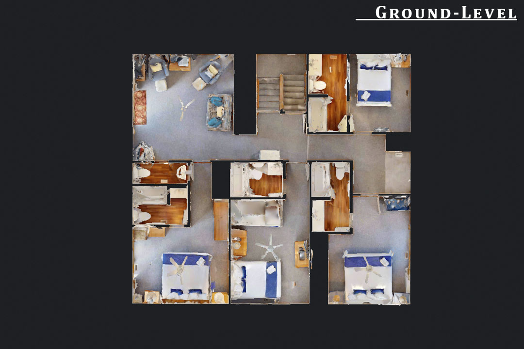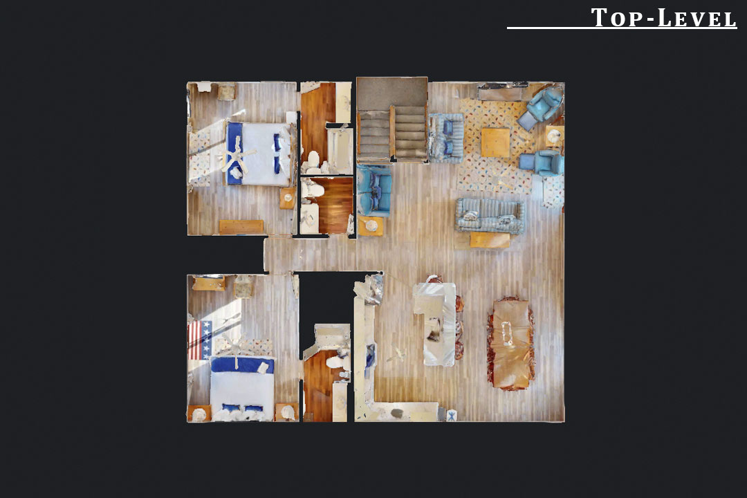 Mid-Level: Den with 55" 4K Smart TV, Mini-Fridge, and Deck Access; King Master Bedroom with Smart TV, Deck Access, and Attached Full Bathroom; King Master Bedroom with Smart TV, Deck Access, and Attached Full Bathroom; Queen Master Bedroom with Bunk Bed, Smart TV, Deck Access, and Attached Full Bathroom; Master Bedroom with Double Bed, Smart TV, Deck Access, and Attached Full Bathroom; Hall Half Bathroom; Laundry Room.