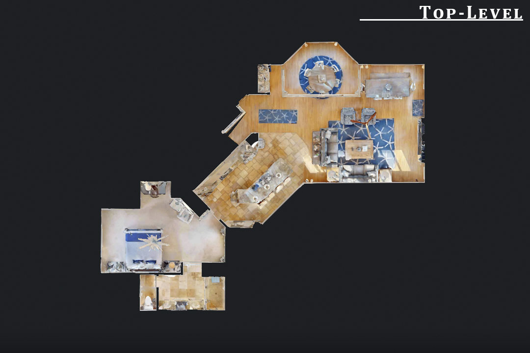 Mid-Level: Den with TV, DVD Player, Mini-Fridge; Workstation; King Master Bedroom with TV, Deck Access, and Attached Full Bathroom with 2 Sink Vanity and Tile Shower with Rain Head, Additional Shower Head and Body Jets; King Master Bedroom with TV, Deck Access, and Attached Full Bathroom with Tile Shower; Bedroom with 2 Pyramid Bunks; Hall Full Bathroom; Laundry Room.