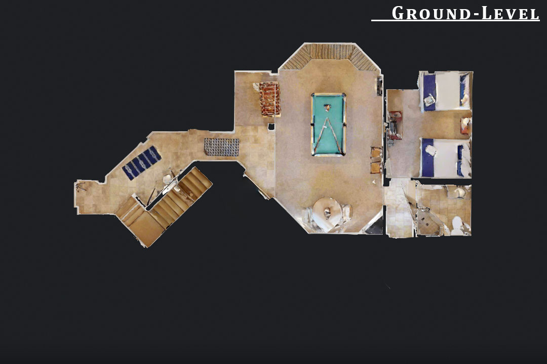 Ground-Level: Rec Room with TV, Foosball Table, Pool Table, and Deck Access; Bedroom with 2 Double Beds; Hall Full Bathroom.